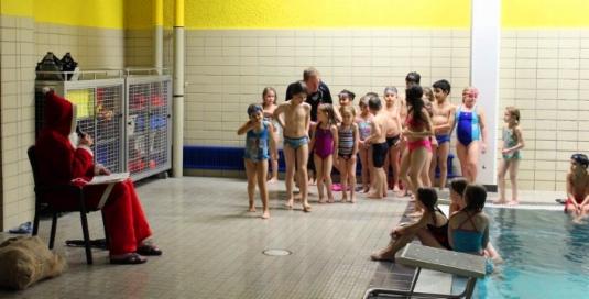 Durch lauten Gesang lockten die über 50 Kinder schließlich sogar den Weihnachtsmann an, der für jeden ein kleines Geschenk dabei hatte. Besonders lobte er die Leistungen der Schwimmerinnen und Schwimmer, die im vergangenen Jahr das Seepferdchen oder das Bronze- oder Silberabzeichen geschafft hatten. Doch auch durch Lieder und Gedichte ließ er sich beeindrucken.