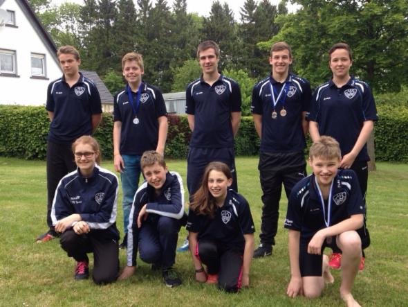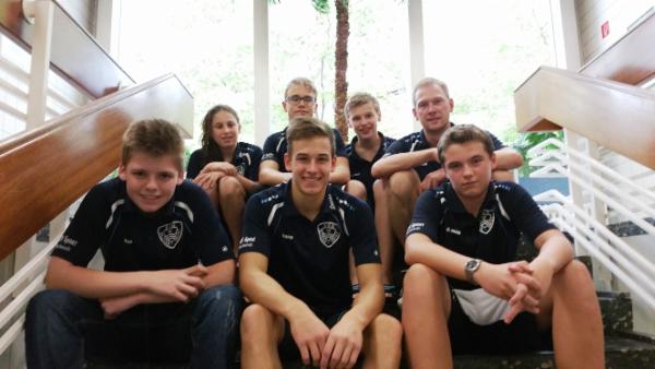vorne v.l.: Fabian Helmboldt, Lucas San José und Marcel Heuser; hinten v.l.: Lia Maleen Volland, Luis San José, Tobias Hahn und Trainer Sebastian Bergfeld.