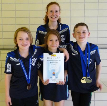 Hannah Opalla, Zoe Doreen Peter und Jan-Ole Runtemund (von links) kehrten erfolgreich von den Kreismeisterschaften zurück. Auch Trainerin Ricarda Schürmann (hinten) freute sich über die guten Ergebnissen.