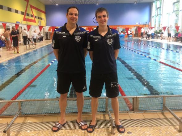 Auch über 100 m Delfin lieferten sich Dominik Peter und Oliver Sloboda ein spannendes Rennen, an dessen Ende beide zeitgleich ins Ziel kamen. Das Zielgericht sprach Dominik Peter den zweiten Platz zu, der sich angesichts der herausragenden Zeit von 1:05,9 Minute mit dem Ergebnis sehr zufrieden zeigte.