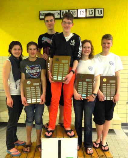 Am Dienstag dieser Woche, 19.03.2013, wurden die Meisterschaften mit den Wettkämpfen über 50m Brust und 50m Freistil abgeschlossen und die besten Schwimmer des Vereins geehrt. Moritz Becker konnte sich mit zwei weiteren ersten Plätzen den Vereinsmeistertitel souverän sichern. Über 50m Brust folgten ihm Lucas San Jose auf dem zweiten und Mattheos Kounatidis auf dem dritten Platz. Über 50m Freistiel konnte Jannik Goseberg sich den zweiten Platz sichern. Lucas San Jose wurde dritter Sieger.