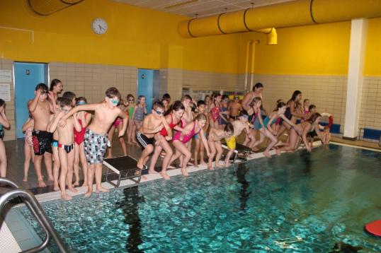 So bekam das Schwimmteam der Grundschüler nicht nur die Gelegenheit Ausdauer, Schnelligkeit und Schwimmstil zu trainieren, es wurde sogar der Wechsel von T-Shirts für die „T-Shirt Staffel“ geübt.